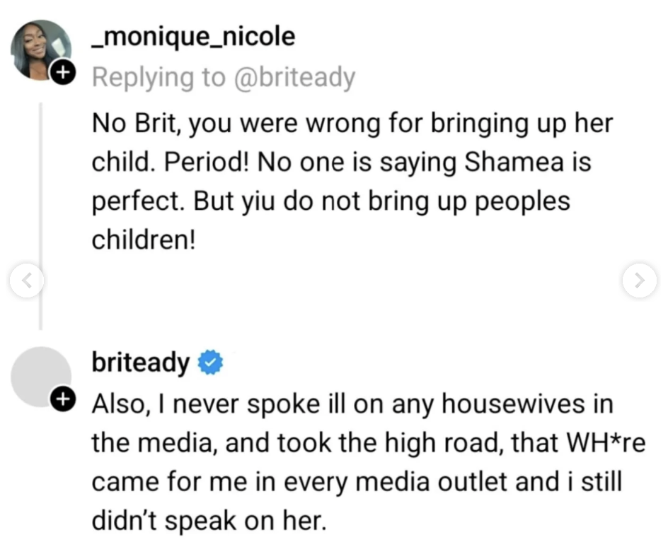 A different fan added, “No Brit, you were wrong for bringing up her child. Period … No one is saying Shamea is perfect. But [you] do not bring up peoples children!”